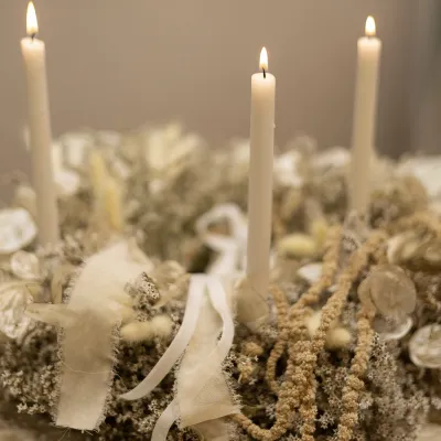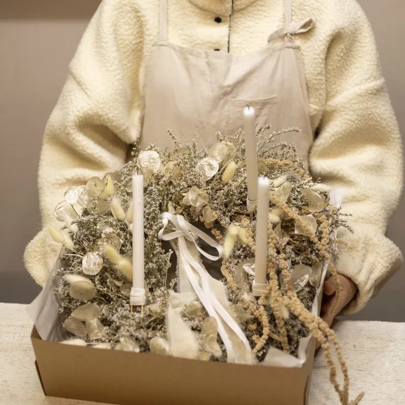 An elegant wreath to decorate a door or table. Candles and festive wrapping are included in the price.